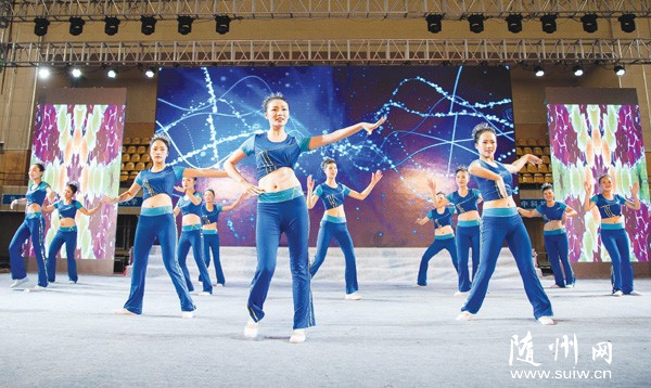 | 9月29日,“五城同創(chuàng),文明健康”隨州市首屆健身舞蹈邀請賽舉行,15支代表隊(duì)參加角逐,農(nóng)商行代表隊(duì)奪魁。圖為市教育局代表隊(duì)表演舞蹈《魅力青春》。 |