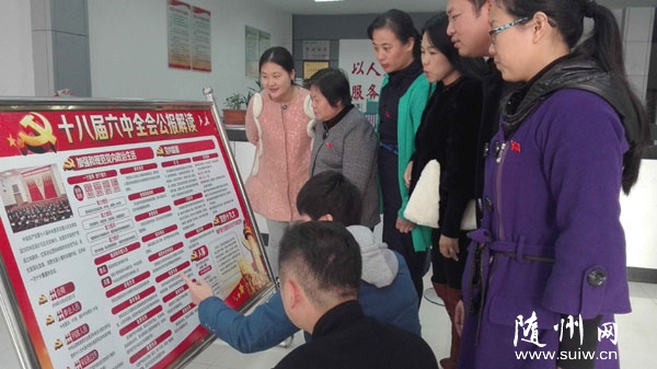 曾都區(qū)東城辦事處龍門街社區(qū)制作宣傳展板,方便居民學(xué)習(xí)黨的十八屆六中全會(huì)精神