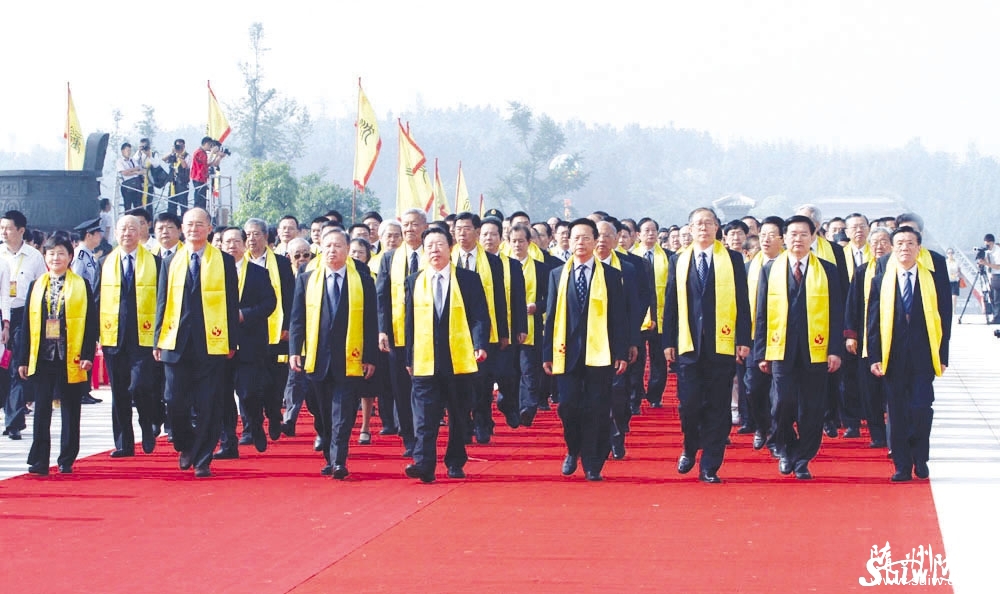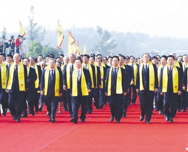 ▲參加尋根節(jié)的領(lǐng)導(dǎo)和嘉賓步入大典現(xiàn)場。前排為:全國人大常委會副委員長陳昌智(前排右四)、全國政協(xié)副主席孫家正(前排左四)、湖北省委書記、省人大常委會主任李鴻忠(前排右三)、全國人大環(huán)境與資源保護(hù)委員會副主任委員羅清泉(前排左三)、湖北省人民政府省長王國生(前排右二)、海峽兩岸關(guān)系協(xié)會副會長李炳才(前排右一)、國務(wù)院僑辦副主任趙陽(前排左二),全國文聯(lián)副主席、黨組成員楊承志(前排左一)。 |