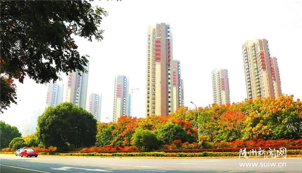 時值深秋,隨州城區(qū)層林盡染,秋色滿目,各種樹木炫色斗艷,將隨城裝扮得美麗如畫。圖為迎賓大道沿途景觀。(隨州日報(bào)通訊員 聶少峰攝)