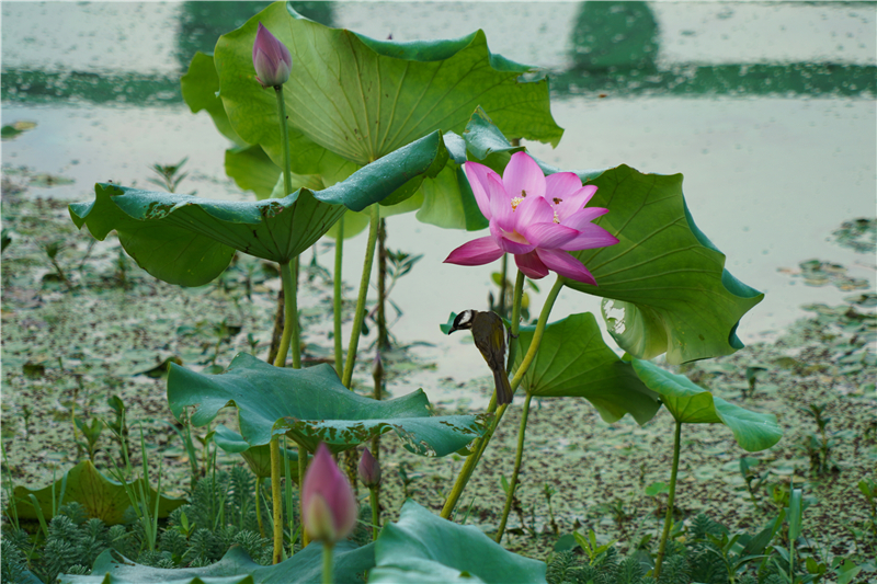 進(jìn)入6月,荷花盛開,鳥兒在荷塘嬉戲,將田園裝扮得分外美麗。(全媒記者孫洪濤攝)