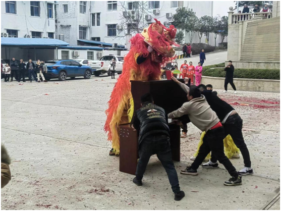 第三個節(jié)目為醒獅表演,兩位表演者穿上醒獅服,將布獅子披在身上,現(xiàn)場觀眾拋出零食、紅包等,獅子騰空而起,在空中將零食接住,逗得現(xiàn)場觀眾捧腹大笑。上臺階,登龍?zhí)莸雀唠y度動作讓觀眾大開眼界。雄獅登頂也預(yù)示吳山鎮(zhèn)新一年各項工作再上新臺階。
