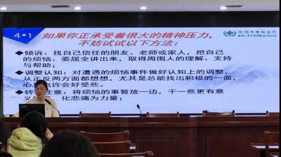 曾都醫(yī)院精神心理科主治醫(yī)師,心理治療師王先丹以《心理問題的識(shí)別與干預(yù)》為題,以日常工作中的醫(yī)療實(shí)例為引,講解了如何衡量心理健康、心理障礙的表現(xiàn)、日常生活中緩解精神壓力的可行性方法。