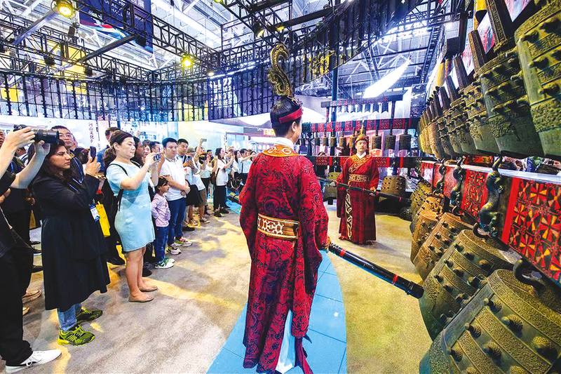 5月23日至27日,隨州編鐘,曾侯乙鑒缶、曾侯乙尊盤(pán)縮比文創(chuàng)品,龍紋銅盒、鹿角立鶴彩金鑰匙扣、盤(pán)龍罍冰箱貼等一批文創(chuàng)產(chǎn)品亮相第20屆中國(guó)(深圳)國(guó)際文化產(chǎn)業(yè)博覽交易會(huì)。(隨州日?qǐng)?bào)通訊員張致棟攝)