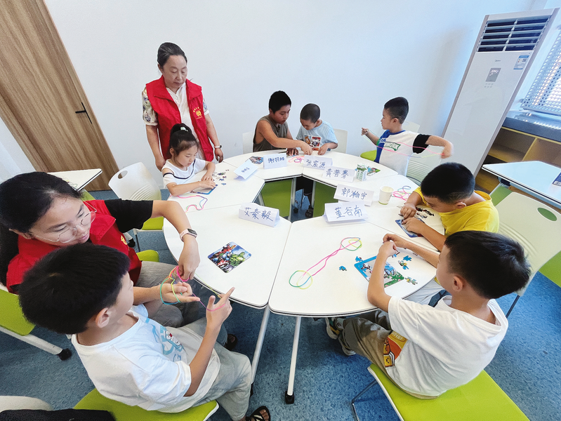 8月9日,在曾都區(qū)北郊街道楚風社區(qū)“暑假學堂”愛心托管班,志愿者老師開設非遺課堂,帶領學生們翻花繩。(隨州日報全媒記者王聰瑩攝)