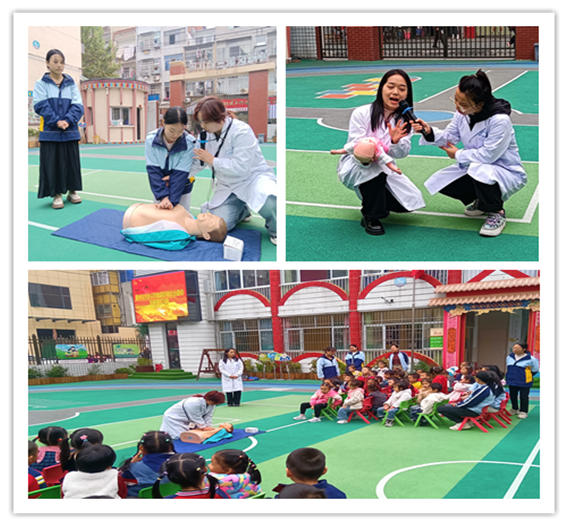 活動現(xiàn)場,秦老師采用互動問答的形式,向幼兒講解日常生活、游戲場景的自我保護要點,深入講解了包括鼻出血、燙傷、骨折等幼兒常見傷害處理方法,并重點示范了心肺復蘇和海姆立克急救法等關(guān)鍵急救技術(shù)。通過現(xiàn)場示范與模擬演練,讓師生們更加直觀地學習和熟練掌握急救技巧。