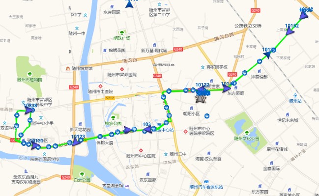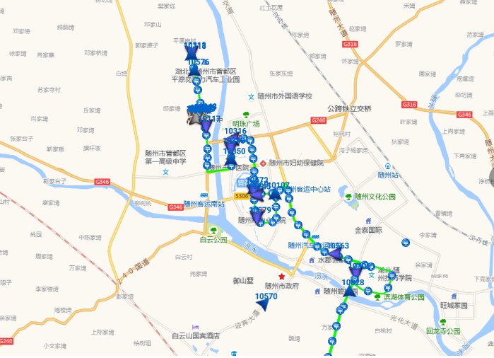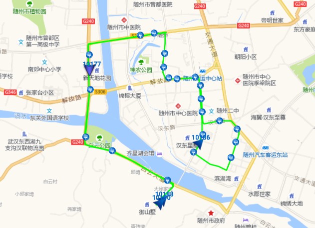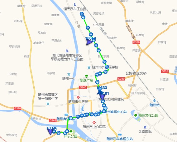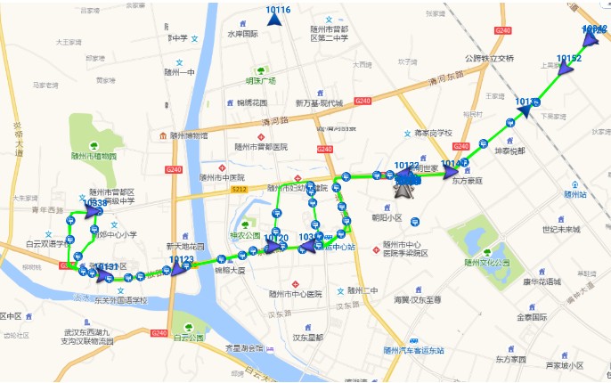 上行(府河化工廠→湖北潤力專汽)方向:府河化工廠→張家灣→金三角→白云公園→二建公司→水務(wù)集團→水西門→小十字街→大十字街→購物中心→客運中心站→澳門街口南→澳門街口→農(nóng)行小區(qū)→交警一大隊→東風(fēng)專汽→清河路口南→清河路口→明珠東路(吾悅廣場)→明珠東路東站→孔家坡小區(qū)→區(qū)城投公司→曾都二中→圓夢星光城東→周家寨→星光五組→星光一路路口→太山廟一組→謝家寨→湖北潤力專汽