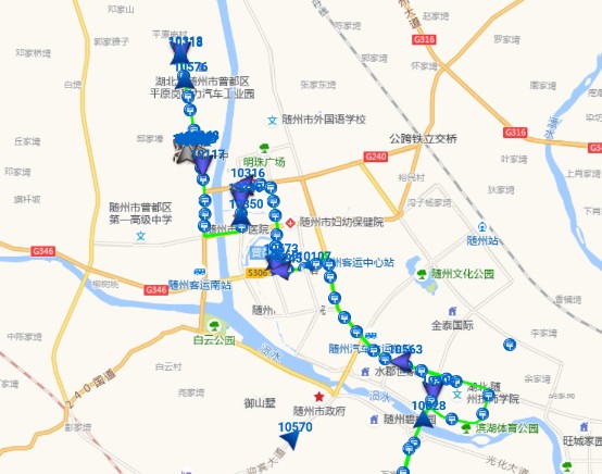 上行(平原崗→高鐵南站)方向:平原崗→程力專汽→平原崗五組→齊鳴公司→市一中北→市一中→馬家榨社區(qū)→博物館→博物館南→擂鼓墩小區(qū)→冷家灣→市中醫(yī)院→市委黨!须娨暸_→清河路中百→曾都醫(yī)院→楚風(fēng)社區(qū)→大潤發(fā)→北門口→慈銘體檢→圣宮飯店→軍翔百貨→市中心醫(yī)院→南關(guān)口房產(chǎn)管理所→南關(guān)口(金和弦琴行)→中保公司→市二中→聚奎門學(xué)!国Q市場→客運中心站→小東關(guān)→鹿鶴加油站→神農(nóng)源廣場→文峰中百→香江商貿(mào)→東興市場→市法院→市公安局→吳家老灣三組→吳家老灣五組→萬達廣場→云海天地二期→御景南山→金都華府→市中醫(yī)院涢水院區(qū)→交投金科府→浪河村十一組→浪河村八組→廖家灣→向陽村三組→向陽村五組→高鐵南站