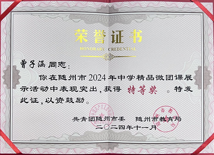 曾都區(qū)實驗初級中學在隨州市2024年中學精品微團課比賽中榮獲特等獎