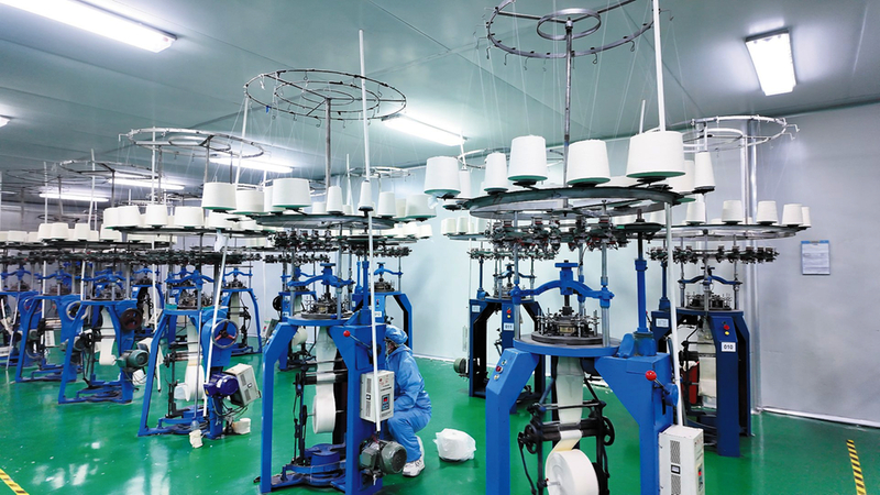 “我們的機器設備自動化程度比較高,車間共有120多臺生產(chǎn)機器,30多人照看即可。像這種生產(chǎn)針織布的機器,一個人就可以照看12臺機器。”譚霞介紹。該公司生產(chǎn)方式先后經(jīng)過5次“革新”,最初采用“人工電焊+手工裁剪”的方式,一名熟練工連續(xù)工作10小時最多能完成5000個口罩。逐步更新?lián)Q代后,現(xiàn)在公司實行全電腦控制的高效生產(chǎn),1名工人10小時可生產(chǎn)6萬個口罩。