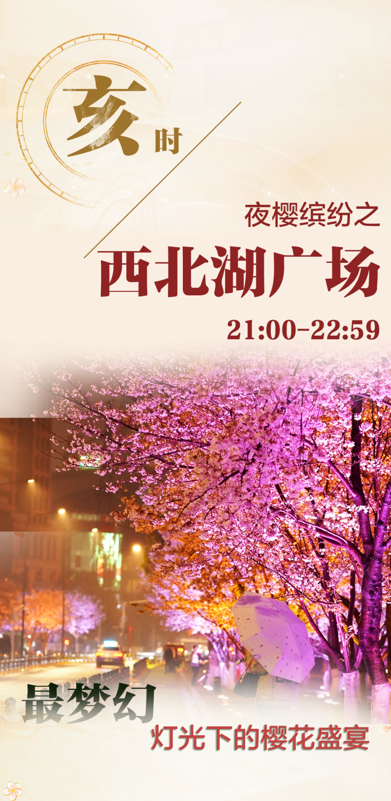 西北湖廣場共栽種有460余株櫻花樹,暮色垂落時,霓虹在櫻瓣上流轉(zhuǎn),460株染井吉野櫻化作懸空的星子,晚上亮燈后,摩登城市的玻璃幕墻將粉紫色光暈揉碎,投進西北湖的漣漪,晚風掠過黃孝西路,落櫻掠過夜跑者的衣角,氛圍絕美。