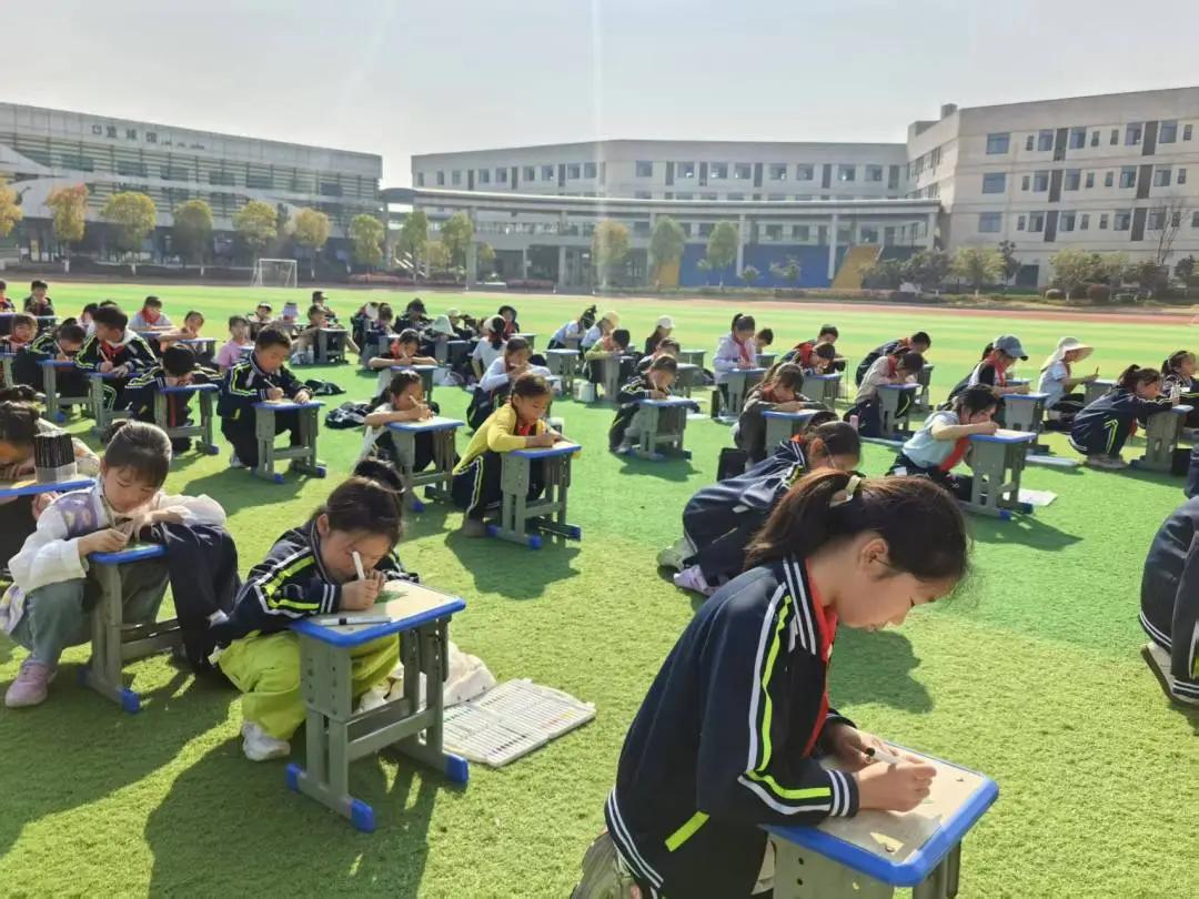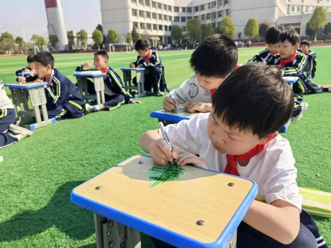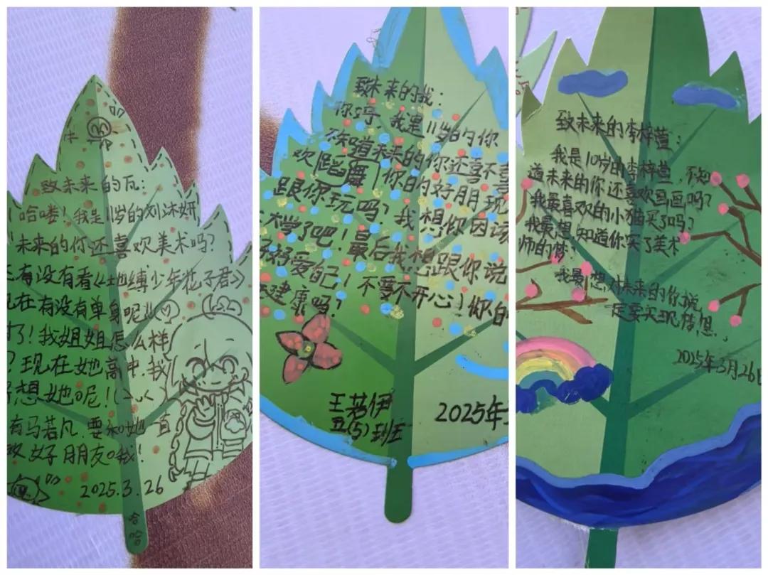 講座尾聲,老師們將代表希望和成長的“葉形信箋”分發(fā)至每個(gè)學(xué)生手中。墨綠色的紙面暈染著春日的溫度,孩子們俯身于凳子上,埋頭認(rèn)真地書寫對五年后自我的期許。筆尖在紙上發(fā)出沙沙的聲音,他們?nèi)褙炞,有的用文字寫下愿望,有的用色彩描繪幸福,有的用符號表情暗藏小心思。透過這些稚嫩的字跡,能觸摸到孩子們心底的微光。