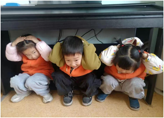 “蹲下、護頭、抓牢!”孩子們在老師指揮下迅速蜷身鉆入桌子下方,小手牢牢抓住桌腿,動作標準如訓(xùn)練有素的小戰(zhàn)士。通過前期《地震來了我不怕》的主題課堂,幼兒們已熟記“伏地、遮擋、抓牢”六字口訣。