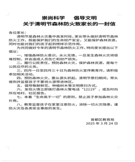 東關(guān)小學(xué)通過(guò)釘釘家校工作群,向全體家長(zhǎng)推送了區(qū)教育局關(guān)于清明節(jié)森林防火致學(xué)生家長(zhǎng)的一封信,家校攜手做好森林防火工作,為保護(hù)環(huán)境助力。