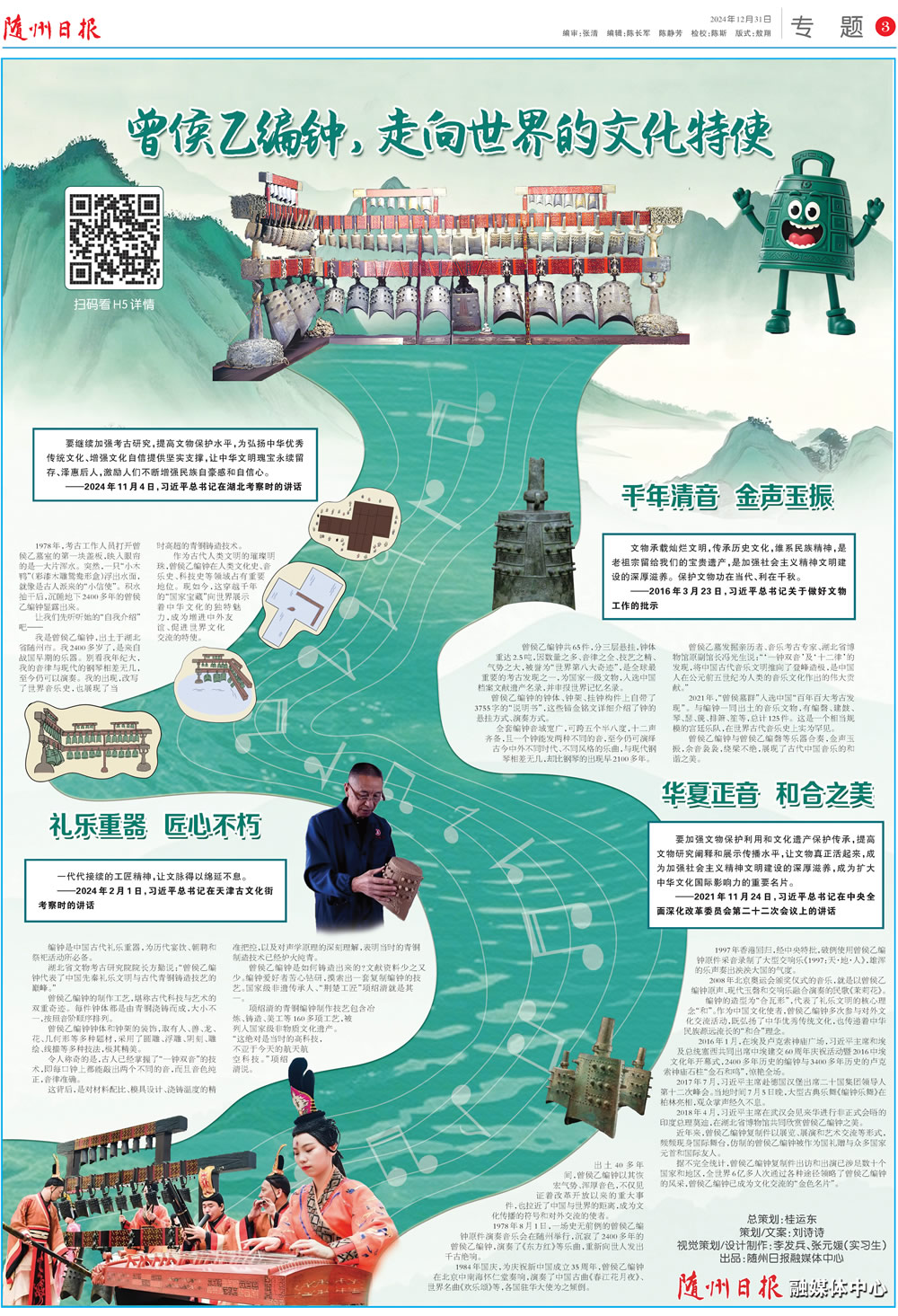 作為古代人類文明的璀璨明珠,曾侯乙編鐘在人類文化史、音樂史、科技史等領(lǐng)域占有重要地位,F(xiàn)如今,這穿越千年的“國(guó)家寶藏”向世界展示著中華文化的獨(dú)特魅力,成為增進(jìn)中外友誼、促進(jìn)世界文化交流的特使。