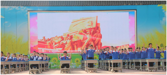 緊隨班級方陣的,是氣勢磅礴的團體節(jié)目表演。百名學(xué)生齊演《捍衛(wèi)中華》桌舞操,以課桌為舞臺,擊掌、拍案、舞臂,整齊劃一的動作,鏗鏘有力的節(jié)奏傳遞出強國少年的豪情壯志;壓軸節(jié)目《鼓舞中國》更是將開幕式推向高潮——中國大鼓震天動地,鼓槌翻飛間激蕩出非遺文化的磅礴力量,而輕盈的水袖翩然環(huán)繞,剛勁與柔美交織,演繹中華文化的兼容并蓄。這場傳統(tǒng)與現(xiàn)代碰撞的視聽盛宴,展現(xiàn)了淅河一小學(xué)子對中華文化的傳承與創(chuàng)新。