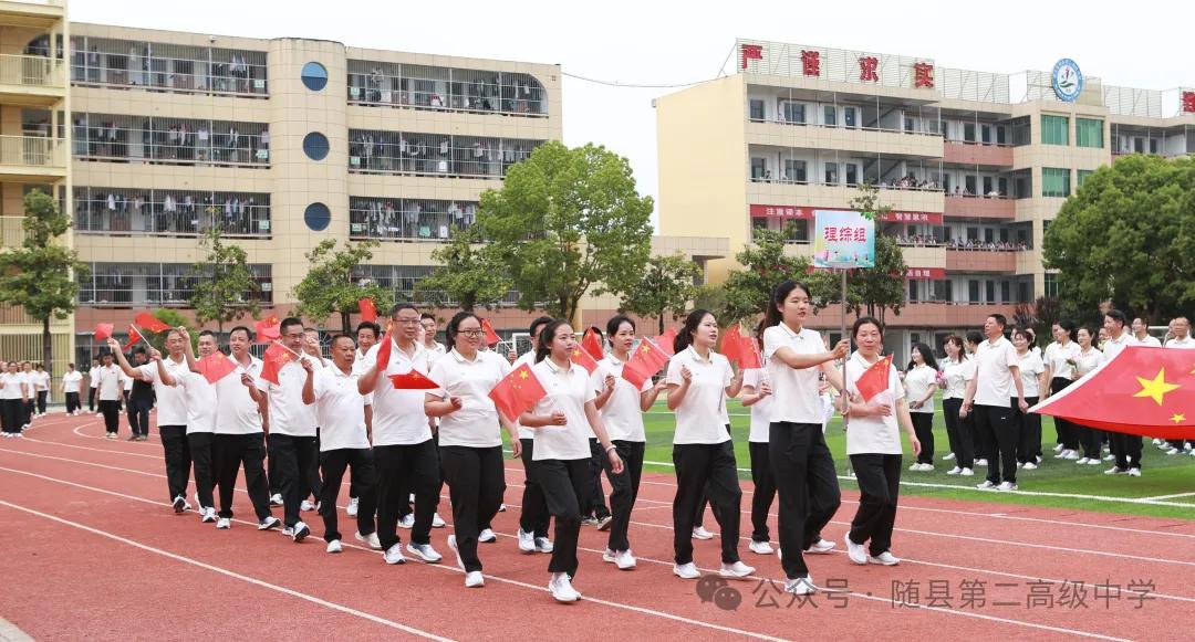 開幕式上,國旗方陣引領前行,校旗方陣緊隨其后,各教研組教師方陣依序進入。老師們手持鮮花,搖動小旗,高舉橫幅,吟誦古詩,齊呼口號,別出心裁的安排和設計細節(jié)感拉滿。各方陣入場完畢, 隨縣二中校長喬宇宙、黨總支書記廖志娟分別致歡迎辭和宣布運動會開幕。