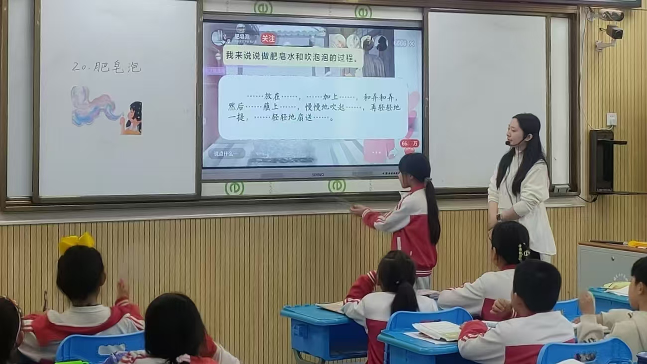 體育教師張武率先在大操場(chǎng)執(zhí)教《足球—腳內(nèi)側(cè)運(yùn)球與變向運(yùn)用》,通過(guò)分組對(duì)抗實(shí)戰(zhàn)提升學(xué)生的控球能力;溫文老師在三(2)班帶來(lái)英語(yǔ)課《Unit6 Numbers in Life》,以情景對(duì)話(huà)引導(dǎo)學(xué)生們用英語(yǔ)表達(dá)身邊常見(jiàn)的數(shù)字符號(hào);黃詠雪老師在錄課室呈現(xiàn)一年級(jí)語(yǔ)文課《小蝌蚪找媽媽》,借助角色扮演和動(dòng)畫(huà)資源,帶領(lǐng)孩子們沉浸式感受童話(huà)的魅力;夏玉琪老師的道法課《生活離不開(kāi)規(guī)則》則通過(guò)校園生活案例分析,啟發(fā)學(xué)生理解規(guī)則的意義。