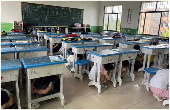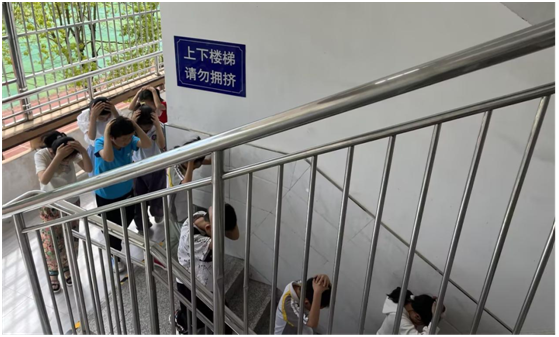 模擬主震過后,各教室里的學(xué)生在教師的引導(dǎo)下,排成整齊的隊形就近從前后門出口有序撤離教室。從教室到空曠的操場集中過程中,同學(xué)們護(hù)頭彎腰有序快速行進(jìn),全體師生爭分奪秒,總共用時1分23秒。