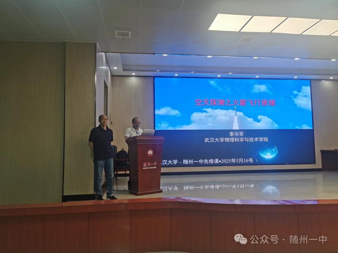 隨州新聞網(wǎng)訊 (通訊員魏友、黃文文)5月16日,武漢大學(xué)隨州一中“大中銜接先修課程”第五期順利開展。此次課程邀請到武漢大學(xué)秦華軍教授,為隨州一中的同學(xué)們帶來了一場別開生面的《空間探測及火箭飛行原理》課程,帶領(lǐng)師生們揭開了火箭世界的神秘面紗;顒(dòng)由教務(wù)處主任占浩主持,高一部分教師、學(xué)生參加。