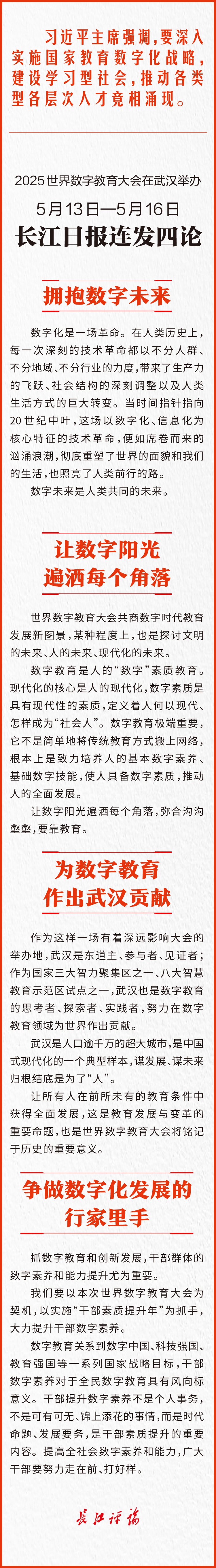 連發(fā)四論,為這一盛會(huì) ©原創(chuàng) 2025-05-16 12:24 0 閱讀全文: 擁抱數(shù)字未來 讓數(shù)字陽光遍灑每個(gè)角落 為數(shù)字教育作出武漢貢獻(xiàn) 爭(zhēng)做數(shù)字化發(fā)展的行家里手 (策劃:劉敏 張凡 評(píng)論員:魯珊 劉功虎 整理:朱晨穎 制圖:肖琴) 【編輯:王戎飛】