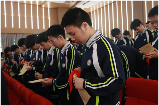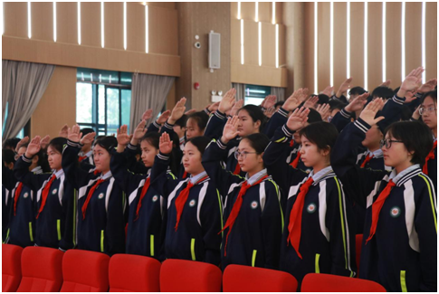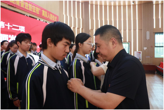 校團(tuán)委趙明鋒老師領(lǐng)學(xué)《團(tuán)章》中有關(guān)團(tuán)員的義務(wù)和權(quán)利的條款,讓新團(tuán)員們明確自身肩負(fù)的責(zé)任與使命。新團(tuán)員代表秦鶴林表示這枚團(tuán)徽不僅是榮譽(yù),更是責(zé)任,今后將以團(tuán)員標(biāo)準(zhǔn)嚴(yán)格要求自己,努力學(xué)習(xí),積極進(jìn)取。老團(tuán)員代表宋瑾瑜同學(xué)分享了自己入團(tuán)后的成長(zhǎng)感悟,號(hào)召新團(tuán)員們用實(shí)際行動(dòng)為團(tuán)旗增光添彩。