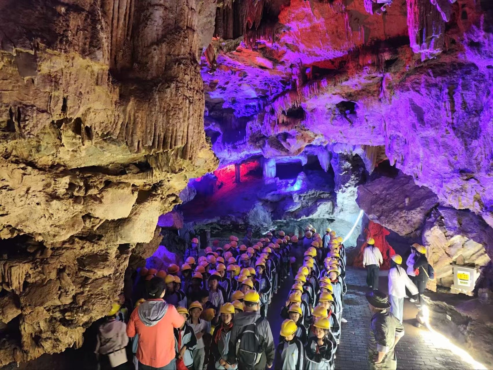 當(dāng)孩子們進入兩王洞時,瞬間被洞內(nèi)奇幻的景象吸引。涼絲絲的微風(fēng)裹挾著濕潤的氣息撲面而來,頭頂上形態(tài)各異的鐘乳石在彩燈映照下流光溢彩,有的像倒掛的冰凌,有的似破土的竹筍,還有的宛如垂落的珊瑚。孩子們小心翼翼地踩著濕漉漉的石階前行,聽導(dǎo)游講述“兩王”的古老傳說。腳下蜿蜒的暗河潺潺流淌,巖壁上凝結(jié)的水珠偶爾滴落,在水洼中濺起細小的水花,曲折的洞道里,響起“太壯觀了”“這就是書里的童話世界吧”贊嘆聲,孩子們的探索熱情不斷升騰。