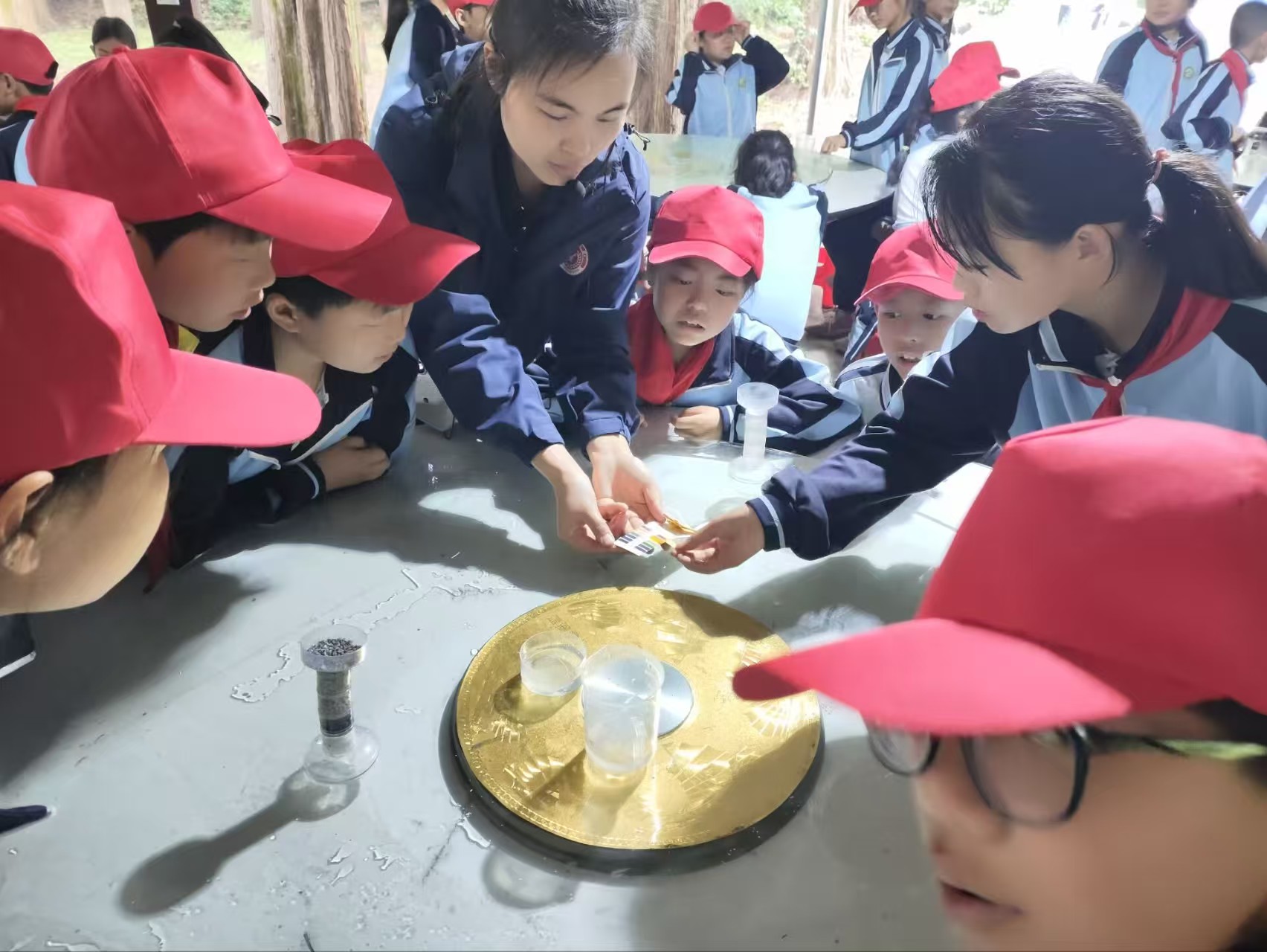 緊接著,水質(zhì)檢測實驗開始。孩子們分組行動,用自制的過濾器過濾水源,用試紙測量溪流的酸堿度,將水樣與標(biāo)準(zhǔn)比色卡對比!霸瓉砬宄旱南畃H值是弱堿性!”孩子們在實踐中加深了對自然環(huán)境的認(rèn)識。