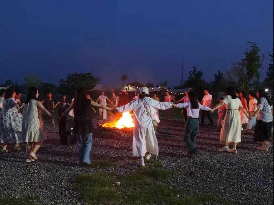 夜幕降臨,熊熊燃燒的篝火照亮了河畔!绑艋饸g歌” 活動(dòng)在這溫暖的火光中拉開帷幕,教師們?nèi)挤艧熁,手牽手圍繞著篝火載歌載舞,每個(gè)人的臉上都洋溢著幸福的笑容。