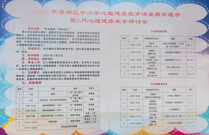 隨州新聞網(wǎng)訊(通訊員張霜)在新時代教育高質(zhì)量發(fā)展的浪潮中,心理健康教育已成為護(hù)航學(xué)生全面成長的關(guān)鍵力量。為深化心理健康教學(xué)改革,培養(yǎng)學(xué)生良好的心理素質(zhì),助力優(yōu)化教育營商環(huán)境,5月21日上午,曾都區(qū)中小學(xué)心理健康教育課堂教學(xué)展示暨5月心理健康教學(xué)研討會在鐵樹學(xué)校成功舉辦。