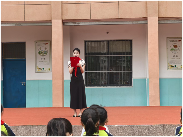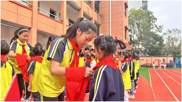 授戴紅領(lǐng)巾環(huán)節(jié)將儀式推向高潮。老隊(duì)員們神情莊重,雙手小心翼翼地為新隊(duì)員系上紅領(lǐng)巾,每一個動作都飽含著關(guān)愛與期許。四(2)中隊(duì)周家君同學(xué)作為老隊(duì)員代表送上寄語,她以自身經(jīng)歷鼓勵新隊(duì)員在成長道路上不懼困難、勇往直前。新隊(duì)員代表發(fā)言時,稚嫩的聲音中滿是對少先隊(duì)組織的向往和為紅領(lǐng)巾增光添彩的決心。