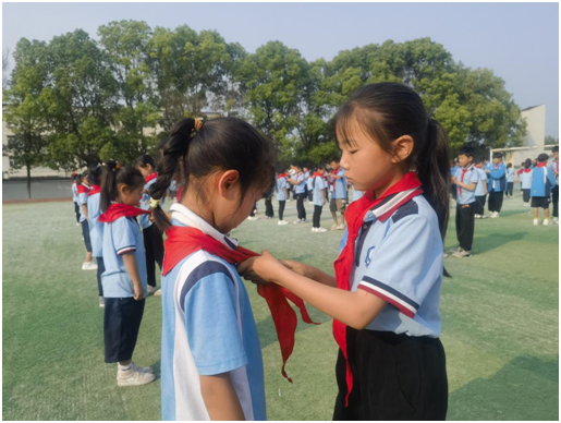 儀式現(xiàn)場(chǎng),大隊(duì)輔導(dǎo)員宣讀新隊(duì)員名單后,五年級(jí)少先隊(duì)員為新隊(duì)員佩戴紅領(lǐng)巾并互敬隊(duì)禮。全體隊(duì)員面向隊(duì)旗莊嚴(yán)宣誓,鏗鏘有力的呼號(hào)聲響徹操場(chǎng)。