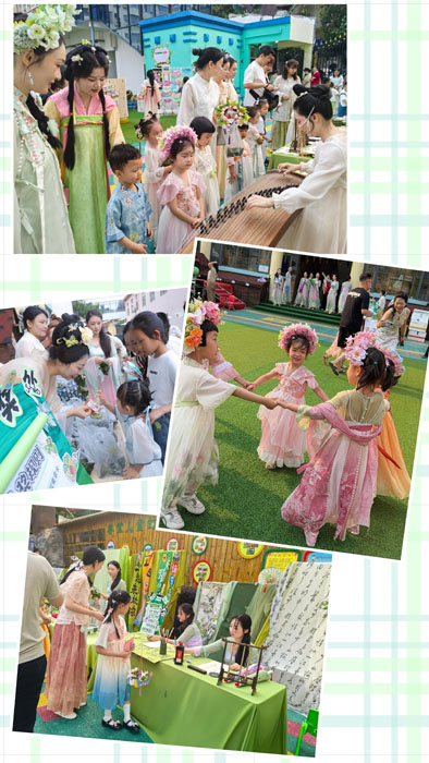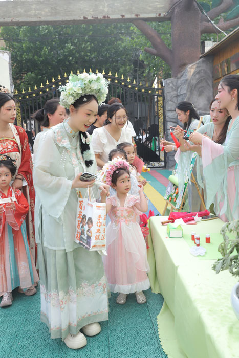 家長(zhǎng)與孩子們身著五彩繽紛的傳統(tǒng)服飾,邁著雀躍的步伐走進(jìn)精心裝扮的園區(qū)。飄逸的襦裙、儒雅的長(zhǎng)衫、婉約的旗袍,成為了一道流動(dòng)的傳統(tǒng)文化風(fēng)景線。