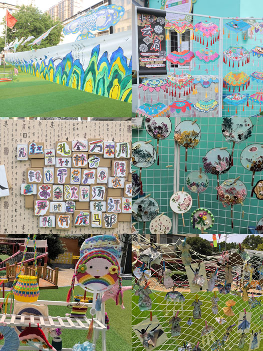 老師們的精心裝點(diǎn)下,幼兒園操場(chǎng)儼然化作了一座靈動(dòng)的傳統(tǒng)文化展館,云肩流彩、花草團(tuán)扇生香、紙鳶翩躚、紙傘輕旋、燈籠搖曳、扎染暈染詩意、編織作品,琳瑯滿目的傳統(tǒng)文化元素,無聲地講述著源遠(yuǎn)流長(zhǎng)的文化故事。