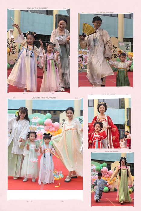 活動(dòng)在悠揚(yáng)婉轉(zhuǎn)的音樂聲中拉開帷幕。老師們化身仙子身著霓裳,一曲傘舞宛如一幅幅流動(dòng)的水墨畫卷,將古典韻味展現(xiàn)得淋漓盡致。隨后的親子走秀環(huán)節(jié),孩子們與家長(zhǎng)攜手盛裝登場(chǎng),或頭戴簪花,或手持團(tuán)扇燈籠,或懷抱古樂器,在舞臺(tái)上依次亮相大方展示自己,每一個(gè)家庭都用獨(dú)特的魅力,詮釋了中華傳統(tǒng)服飾與文化之美。