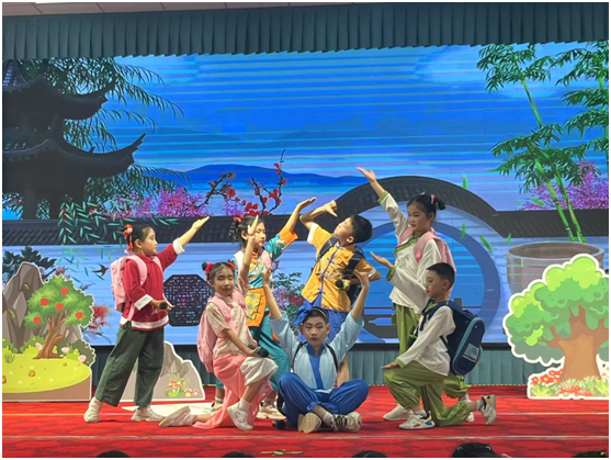 隨后,文藝匯演在歡快活潑的舞蹈《霍元甲》中拉開帷幕。舞臺上,孩子們化身靈動的精靈,用稚嫩卻充滿力量的表演展現(xiàn)風(fēng)采。三年級小朋友帶來的音樂課本劇《司馬光砸缸》童趣十足,生動的表演引得觀眾捧腹大笑;學(xué)生的詩歌朗誦《永遠(yuǎn)的九歲》慷慨激昂,展現(xiàn)出對祖國的熱愛;還有精彩的樂器演奏、動感的啦啦操等節(jié)目輪番上陣,充分展示了孩子們的藝術(shù)素養(yǎng)和蓬勃朝氣,現(xiàn)場歡呼聲、掌聲此起彼伏。