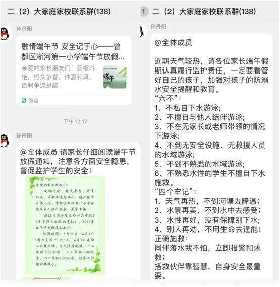 學(xué)校深知學(xué)生安全需要家校社協(xié)同守護。通過班級QQ群、學(xué)校微信公眾號等網(wǎng)絡(luò)平臺,政教處及時向全體家長推送了《端午假期學(xué)生安全溫馨提示》,明確假期安全監(jiān)護責(zé)任,呼吁家長切實加強對孩子的安全教育和日常管理,尤其在防溺水、外出交通等方面加強關(guān)注與防范,形成家校聯(lián)動、齊抓共管的強大合力。