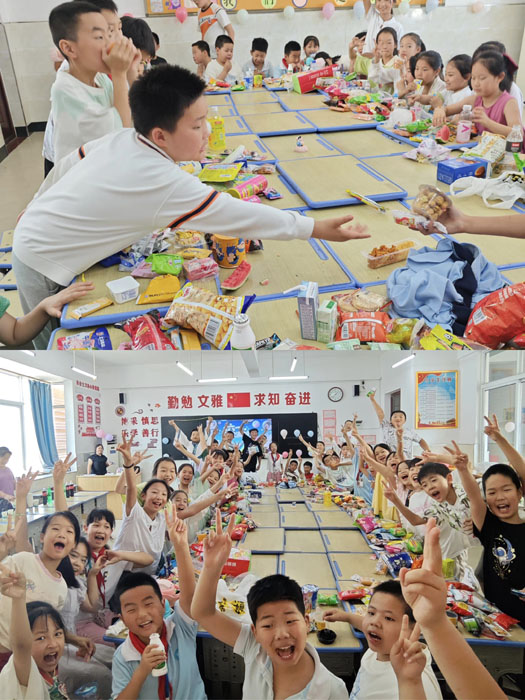 同學們帶來琳瑯滿目的零食和水果,西瓜、飲料、小餅干等擺滿課桌。大家互相分享美食,連老師也加入“吃貨團”,干杯聲與笑聲交織,甜蜜與幸福在教室里流淌。