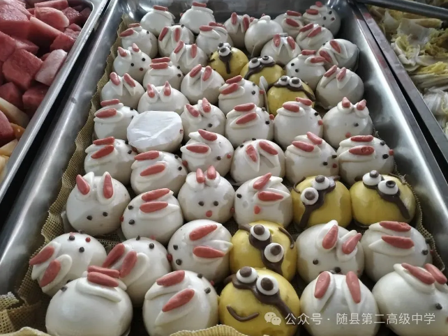 最妙的是卡通動物的面點,這是食堂師傅們用面團捏出的祝福:祝大家高考時“面面”俱到,“點”石成金!同學們圍坐在餐桌前,吃著美味可口的飯菜,有說有笑,大快朵頤。