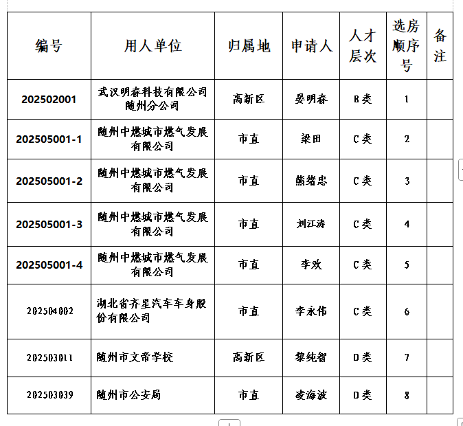 根據(jù)《隨州市人才公寓管理辦法(試行)》相關(guān)規(guī)定,經(jīng)申請(qǐng)人申請(qǐng),用人單位初審,創(chuàng)服公司受理,市住建部門(mén)房產(chǎn)核查,用人單位所在地人才辦資格審核,市委人才辦審批,共8名同志符合隨州人才公寓(產(chǎn)投·梧桐匯)租賃條件。本次配租原則上按照A、B、C、D類(lèi)人才的先后順序依次選房;同類(lèi)人才按照遞交申請(qǐng)時(shí)間先后順序依次選房;同一用人單位的同類(lèi)人才,按照用人單位提交的《隨州市人才公寓租賃申請(qǐng)信息匯總表》排列順序依次選房,F(xiàn)將審核通過(guò)人員名單和選房順序號(hào)予以公示(詳見(jiàn)附件)。