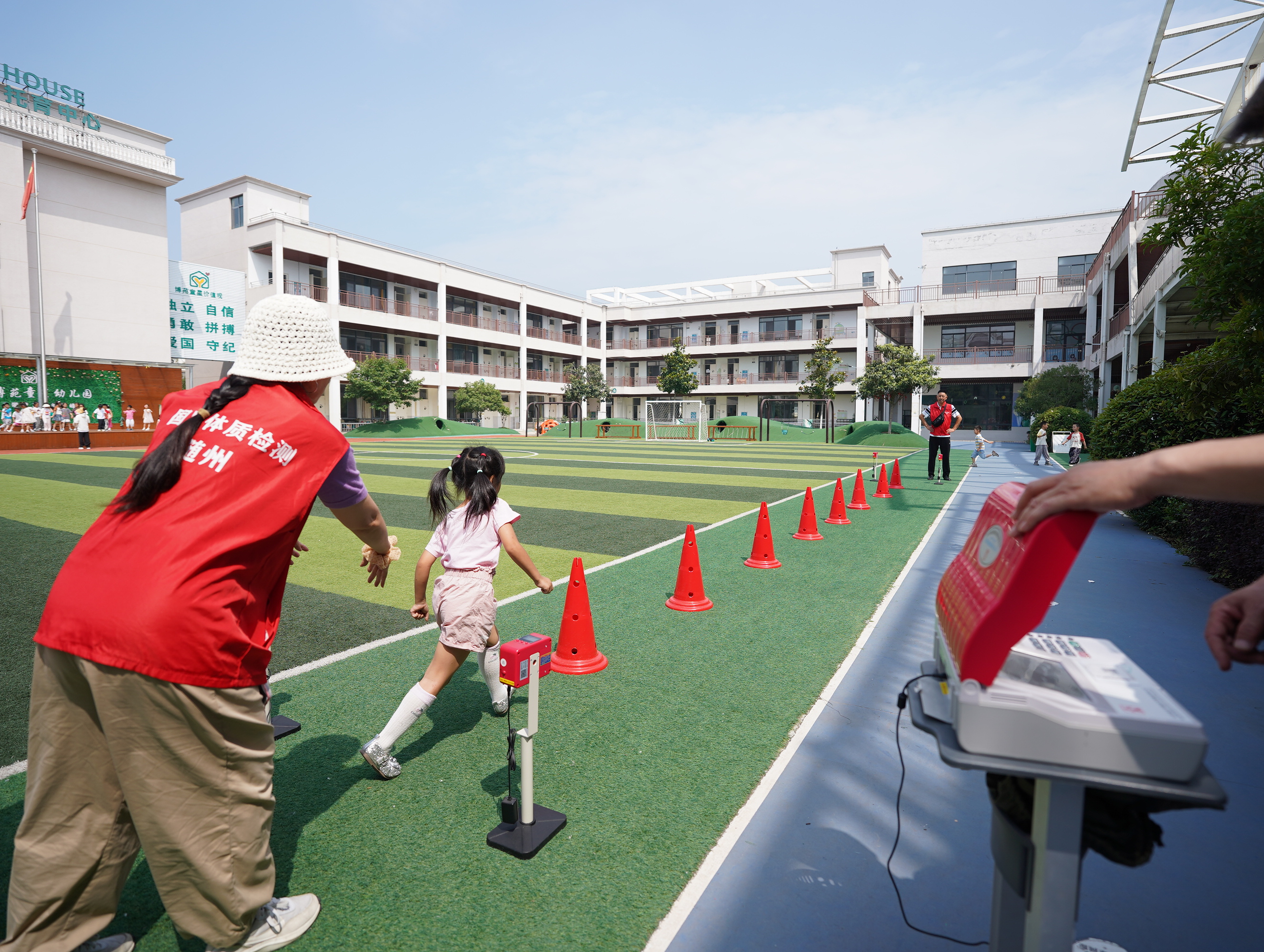 檢測(cè)現(xiàn)場(chǎng)設(shè)置身高體重測(cè)量、坐位體前屈、立定跳遠(yuǎn)、15 米繞障礙跑等六大項(xiàng)目,從身體形態(tài)、機(jī)能、運(yùn)動(dòng)素質(zhì)三方面為幼兒 “健康畫像”。工作人員手持卡通量尺、趣味障礙物,讓測(cè)評(píng)變成