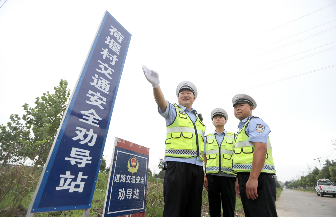 十里鋪派出所在各村設(shè)立交通安全勸導(dǎo)站,民警在勸導(dǎo)站疏導(dǎo)交通安全。