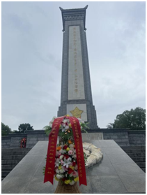 經(jīng)過短暫的休整,下午隊伍抵達蒼松翠柏掩映下的黃麻起義和鄂豫皖蘇區(qū)革命烈士陵園。雨絲漸密,更顯莊嚴(yán)肅穆。在巍峨的革命烈士紀(jì)念碑前,全體人員肅立,敬獻花籃,三鞠躬深切緬懷為革命勝利獻出寶貴生命的先烈們向他們致以最崇高的敬意。
