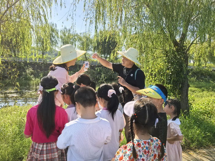 活動(dòng)中,孩子們手持望遠(yuǎn)鏡深入湖畔、田地、密林,邂逅了多種鳥類。廖雨蒙同學(xué)率先發(fā)現(xiàn)“小寶石”普通翠鳥,大家靜靜觀察其“守株待兔”的捕食模樣;當(dāng)林中彩虹“仙八色鶇”現(xiàn)身時(shí),其身上藍(lán)、綠、紅、栗等八種色彩讓孩子們驚嘆,曾老師介紹這是國家二級保護(hù)動(dòng)物,珍稀又美麗。