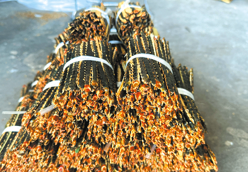 走進(jìn)三元公司,成堆竹竿引人好奇,答案藏在分揀車間:每條蜈蚣腹部緊貼細(xì)竹片,密密麻麻的腳將其緊緊抱住!斑@樣曬干不會(huì)斷,能減少分揀、運(yùn)輸損耗!饼彺笥呀忉尩。
