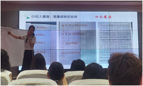 “墨香潤(rùn)童年,筆韻伴成長(zhǎng)”,談及班級(jí)書(shū)法教學(xué)經(jīng)驗(yàn),潘艷從:初入墨境,筆墨成快樂(lè)玩伴;借力專(zhuān)業(yè),讓墨香飄遠(yuǎn);參與活動(dòng),做舞臺(tái)中央的人;以賽促學(xué),孩子們?cè)綄?xiě)越自信;總結(jié)與展望五個(gè)方面娓娓道來(lái)。