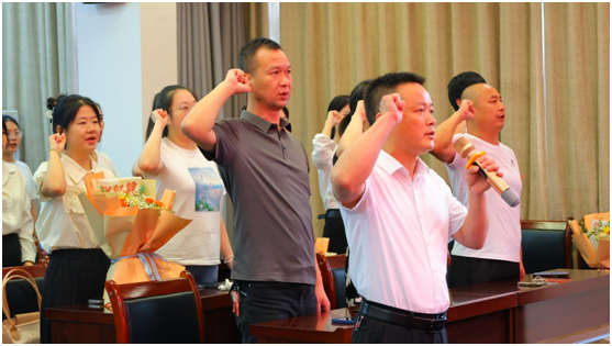 隨后,學(xué)校黨支部書記、校長蔣超帶領(lǐng)全體教師舉起右拳集體宣誓:“我是光榮的人民教師,忠誠黨的教育事業(yè),貫徹黨的教育方針……為培養(yǎng)擔(dān)當(dāng)民族復(fù)興大任的時代新人而努力奮斗!”錚錚誓言,彰顯的是學(xué)校教師堅守教育初心、勇?lián)耸姑膱远Q心;回聲激蕩,傳遞的是以教育家精神鑄魂強師、助力教育強國建設(shè)的責(zé)任擔(dān)當(dāng)。