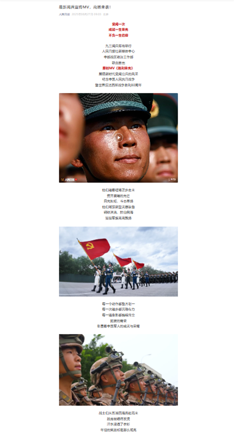 圖左二為隨州職業(yè)技術(shù)學(xué)院文化旅游產(chǎn)業(yè)學(xué)院2020屆畢業(yè)生邱傲訓(xùn)練時(shí)照片,該照片登載在人民日?qǐng)?bào)微信公眾號(hào)8月27日《最新閱兵宣傳MV,高燃來(lái)襲!》