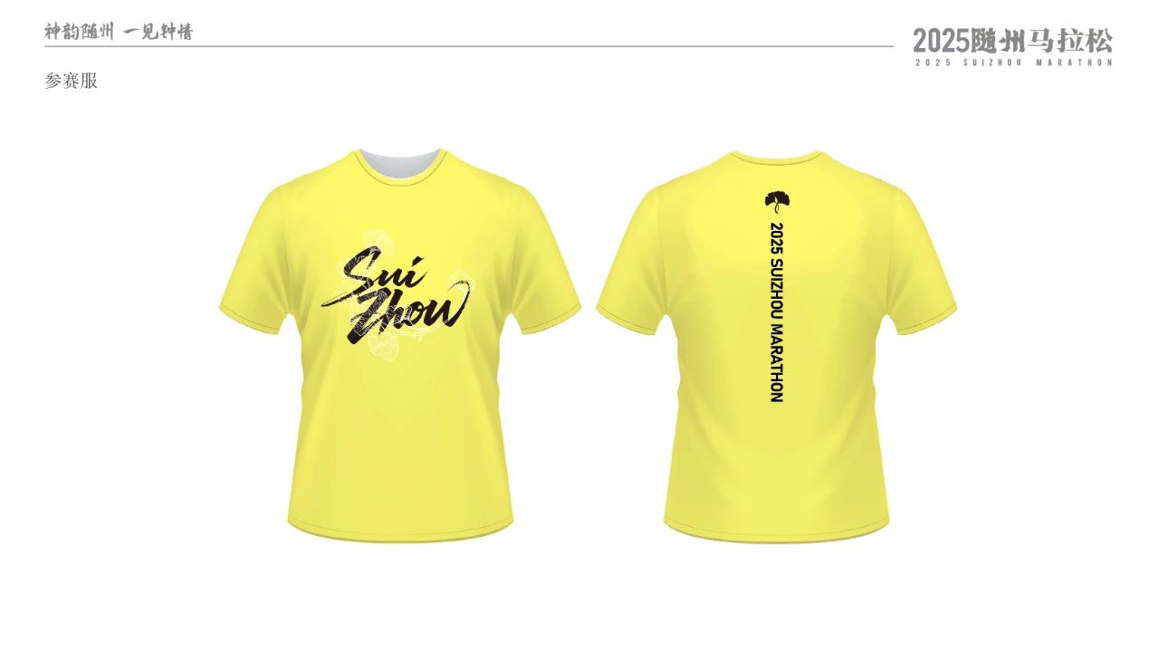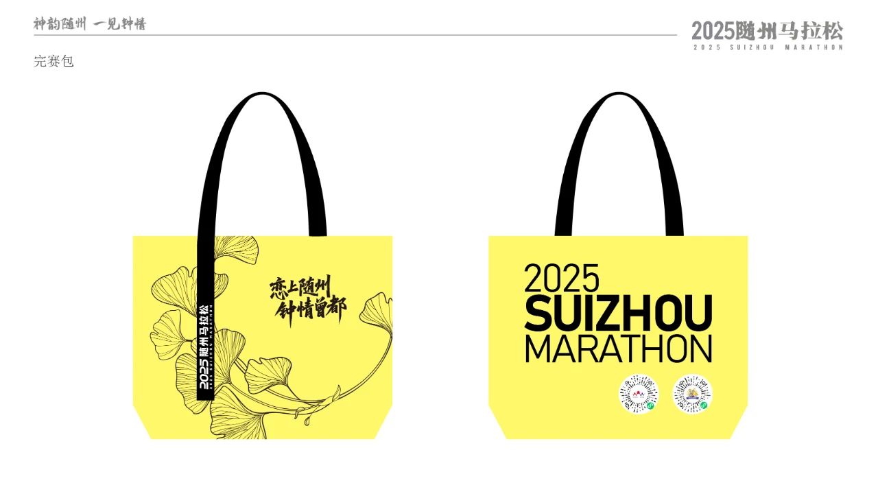 參賽物料設(shè)計(jì)深度融入隨州特色文化。參賽包采用紅黃主色調(diào),正面以銀杏葉輪廓匯聚成“江山如畫”,背面突出“戀上隨州、鐘情曾都”。完賽獎(jiǎng)牌以多片錯(cuò)落銀杏葉構(gòu)成主體輪廓,背面飾以編鐘紋路與象征音符的線條。