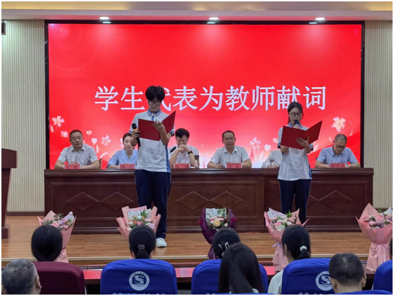 會(huì)上通報(bào)表?yè)P(yáng)了市、縣級(jí)和校級(jí)先進(jìn)教師,包括“隨州好老師”、“卓越班主任”、“優(yōu)秀教師”等多項(xiàng)榮譽(yù)。學(xué)生志愿者向優(yōu)秀教師代表獻(xiàn)花致敬。優(yōu)秀教師代表陳寶麗、劉全軍分享教育心得。